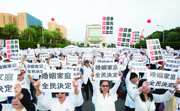 去年11月24日與地方選舉合併舉行的公投中,第10案以765萬餘票的絕對過半數,支持現行民法婚姻篇條文對「婚姻」的定義,應侷限於一男一女結合,就民進黨以往鼓吹公投不遺餘力,民意代表應根據公投結果修正法令條文來才合乎常理。