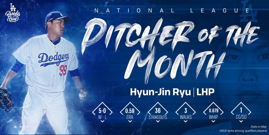 根據《道奇國度網》報導,效力於道奇隊的南韓怪物強投柳賢振終於榮獲肯定,他於4日獲得官方頒發的5月國聯最有價值先發投手獎,攤開他的成績:5勝0敗、0.59ERA,更曾寫下連續32局無失分的驚人紀錄,整個月僅投出3次保送,在在說明他獲獎是無庸置疑。