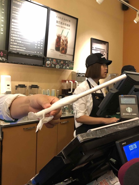 台北市環保局副局長陳沼舟於1日帶隊稽查百貨公司餐飲部,該百貨公司內的星巴克咖啡已改用「紙吸管」、麥當勞改為「以杯就口」,稽查結果全面合格,他說:「希望這一小步跨出去後,未來只有博物館裡才能看得到一次用塑膠吸管。」
