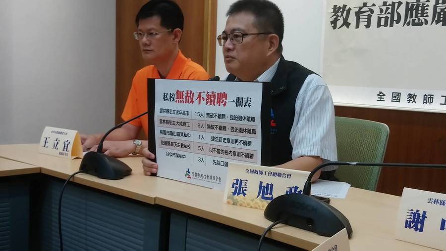 張旭政表示,雲林縣私立大成商工在去年違法解聘或不續聘的9位教師中有6位是擁有比較長的服務年資,另外3位遭學校片面宣稱與教師有約定,但是經過全教總的協助,9位教師經評議都獲有理由等待救濟,但是學校仍拒不執行評議結果。
