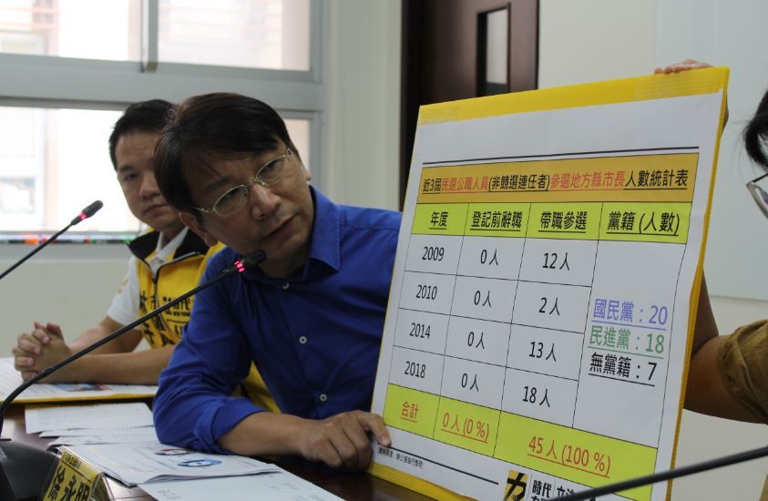 徐永明指出,近3屆民選公職人員(非競選連任)參選地方縣市長人數統計,共有45人帶職參選,2009年有12人、2010年2人、2014年13人、2018年最多達18人,其中國民黨有20人,民進黨18人,無黨籍7人。