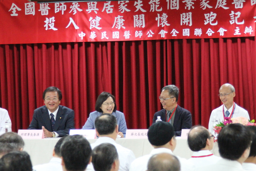 蔡英文總統與醫師們一同高喊:「醫師來厝內,失能有保庇!」(photo by 祝潤霖/台灣醒報)