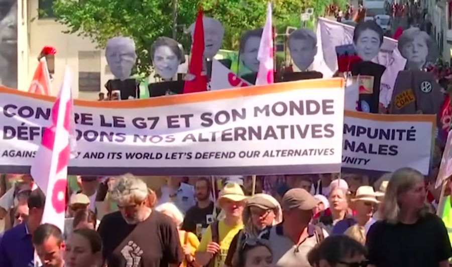 根據《歐洲新聞台》報導,數千名示威者24日在舉辦G7的比亞里茲鎮周邊遊行,行經路線從法國南端的昂代伊到西班牙北部的希盧恩。上街群眾的主要訴求包括提倡環保與反全球化,希望參加G7的領導群著手處理相關議題。示威者指出,G7高峰會代表著資源的剝削,「領導人用盡地球上的所有資源,卻忽略了人道危機、氣候變遷等重要議題。」