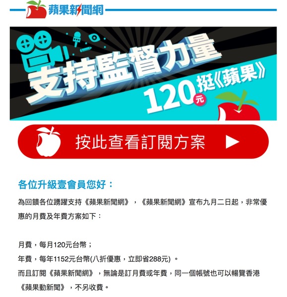 蘋果官網上的定型化契約(壹傳媒集團服務協議條款及條件)「《蘋果新聞網》(台灣)訂閱服務」內文表明:本公司在9月2日推行《蘋果新聞網》升級壹會員優惠訂閱服務,並指出「每月月費NT$120元。」值得注意的是,廣告信中有一段提到會在9月2日自動扣款,但字眼藏在段落之中,未予強調,字體亦無加大,很容易受到忽視。