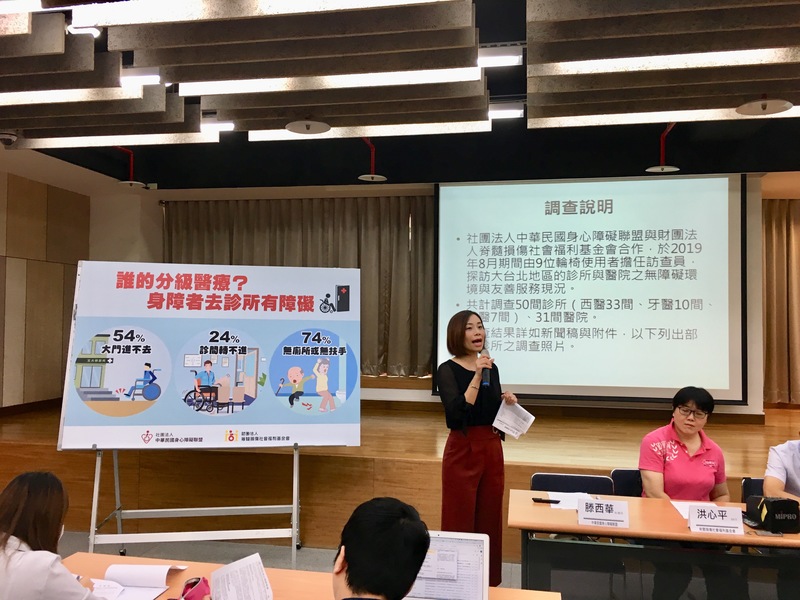 基層的診所是民眾生病第一個去的地方,但身心障礙者卻去不了,常常被告知沒有足夠空間或設備。身心障礙聯盟秘書長滕西華表示:「應該符合評鑑標準的大型醫院,也有9-30%不符合標準,這是我比較驚訝的地方。」我國已將無障礙設施評鑑納入醫院評鑑,但多家醫院及醫學中心並無完善之無障礙設施,評鑑是否落實有待商榷;許多診所的設施也不符合身心障礙者的人體工學。