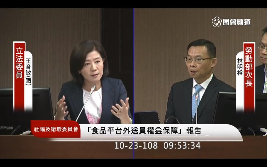 王育敏也提到,國發會和勞動部似乎不同調,國發會表示要業者先行自律,自行與業者開會而沒有邀請勞動部。林明裕表示,自律和勞檢是可同時進行的。王育敏也提供勞動部兩個選項,參考德國成立「類勞工」的法律以規範外送業,或是適用原本勞基法。林明裕則回應,新法正研究當中。