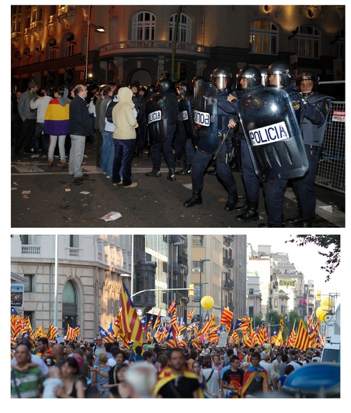 英國《獨立報》指出,在和平大遊行一如往常舉行的同時,巴塞隆那警察總部前面則上演暴力戲碼。一個較偏好以直接行動表達獨立信念的組織CDR為這場遊行的發起者。他們在當地時間晚上七點半號召了約1萬人,並開始對嚴陣以待的警察丟擲物品。警方則在20輛鎮暴車的支援下,向群眾發起衝鋒。