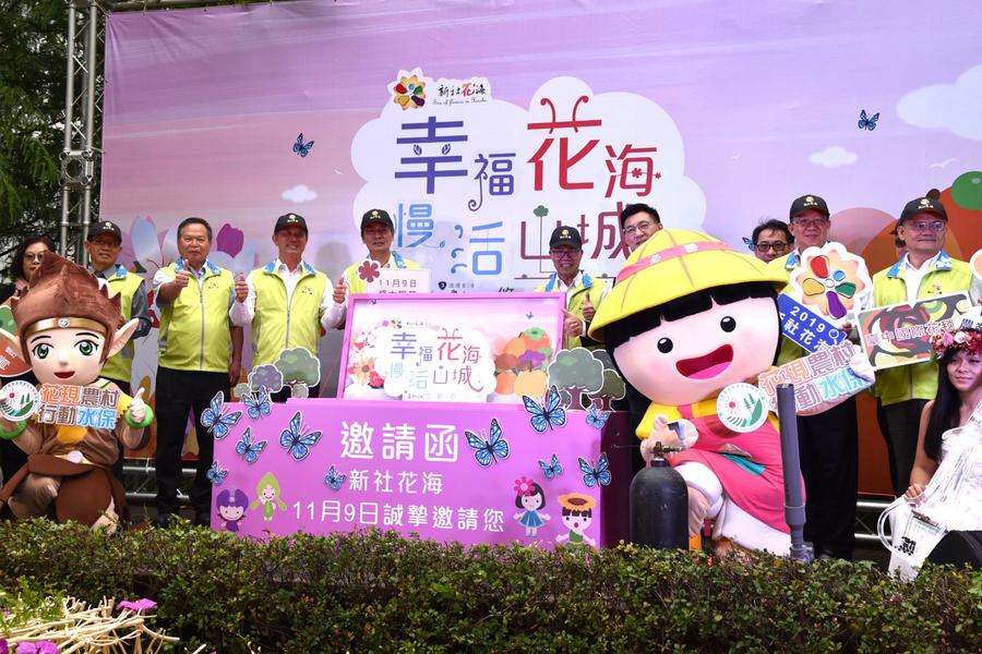 展前記者會上由3名穿著白紗的女小提琴家帶來的動感電子音樂演出震撼開場,揭開台中新社花海節的序幕。2019年新社花海節以「幸福花海 慢活山城 悠遊台三線」為主題結合「國際花毯節」,將大面積花海用色彩漸層手法,打造景觀散播區,面積高達16公頃。