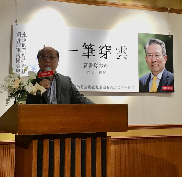 【台灣醒報記者施凱文台北報導】已故資深記者劉屏18日出版其人生第一本也是最後一本書《一筆穿雲:永遠的華府特派員劉屏的軍魂國魂與靈魂》,現場將星雲集,前台中市長胡志強表示,劉屏是一位找不到缺點的人;前國安會秘書長胡為真則說:「劉屏針對時事的報導鞭辟入裡,看文字就可感受其出色的人格風範。」