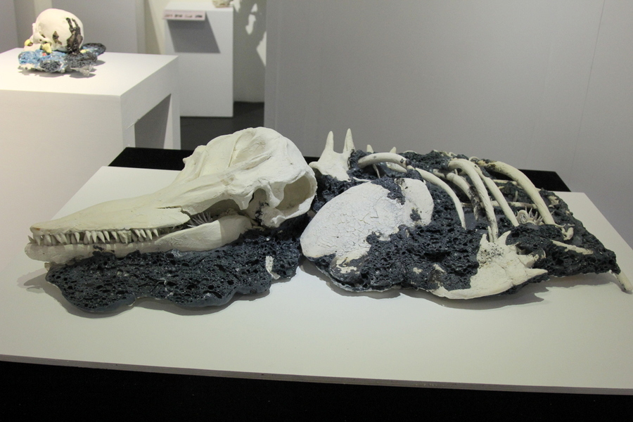 王裔婷作品《重生於永恆之內》、《重生於束縛之外》、《重生於膠著之中》、《自娛自樂》,表達各種因人為破壞而死亡的生物成為化石的狀態,輪船廢油、工業有毒汙水如瀝青黏稠的毒濃侵蝕海豚的遺骸。吃下太多塑料廢棄物的信天翁,被網子纏住的海龜,被海洋油汙沾染的海豚,人類則口中塞滿了上述毒物。