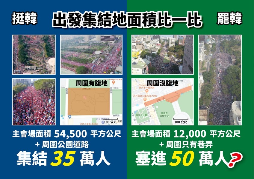 鄭照新質疑,從Google map計算從高雄文化中心到鹽埕區的遊行路線共12.2萬平方公尺,以每平方公尺站3人計算,就算活動期間整條路塞滿人潮,也頂多容納36.7萬人,根本塞不進50萬人,50萬人要塞滿整條路共需11公里長,相當於高雄文化中心到左營,但罷韓遊行全程只有4公里,根本與宣稱的50萬人不符。