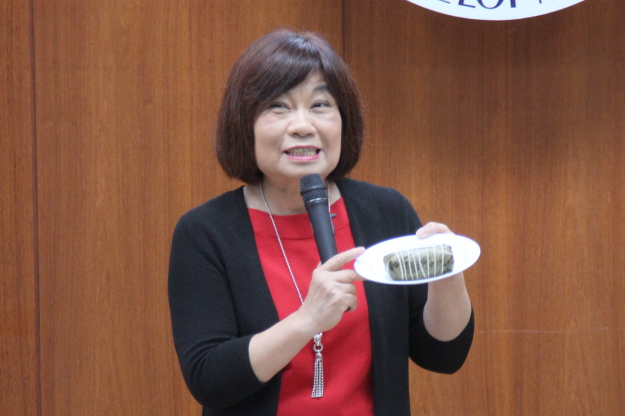 國發會主委陳美伶示範如何用粽繩切開原住民「阿拜」,供大家分食享用。(photo by 祝潤霖/台灣醒報)