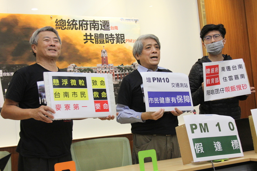 健康空氣行動聯盟理事長葉光芃感慨,近乎全世界最寬鬆的台灣PM10空品標準,2019仍延續前1年的假達標(65微克/立方米的台灣年均值)、真殺人(高於20微克/立方米的WHO準則年均值)。他呼籲民進黨副總統候選人賴清德應履行先前政見,將總統府南遷至PM10最糟的台南市,與人民同甘共苦。