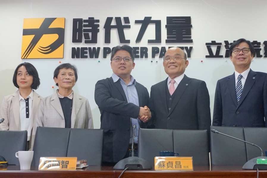 行政院長蘇貞昌(左3)率副院長陳其邁(左2)等團隊,在民進黨團總召柯建銘等陪同下,至民眾黨立院黨團拜會。(photo by 台灣民眾黨)