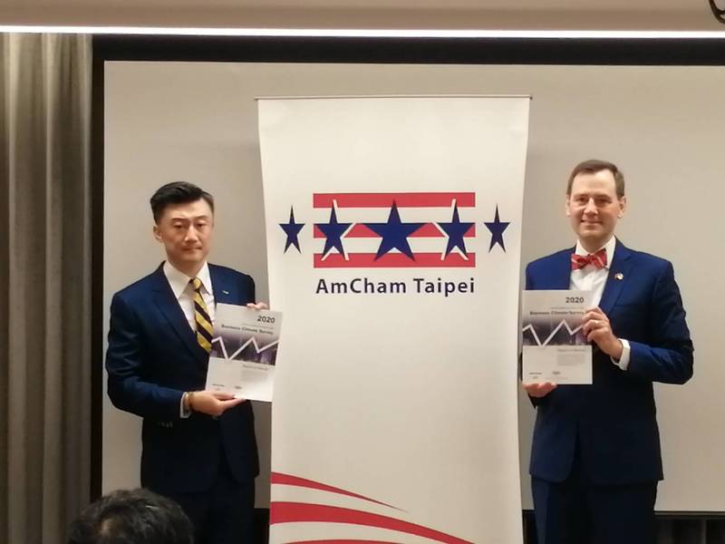 「2020商業景氣調查」是對391位在台美商代表進行的問卷調查(回收率為50.3%),金奇偉指出,59.9%的會員對台灣今年的經濟成長懷有信心,高於2019年的46%,他也列舉數個對美商前景有利的因素,譬如台商回流、半導體產業的成長、「非常好」的台美關係以及順利運作的大選,但有84%對於台灣的資安威脅感到憂慮。