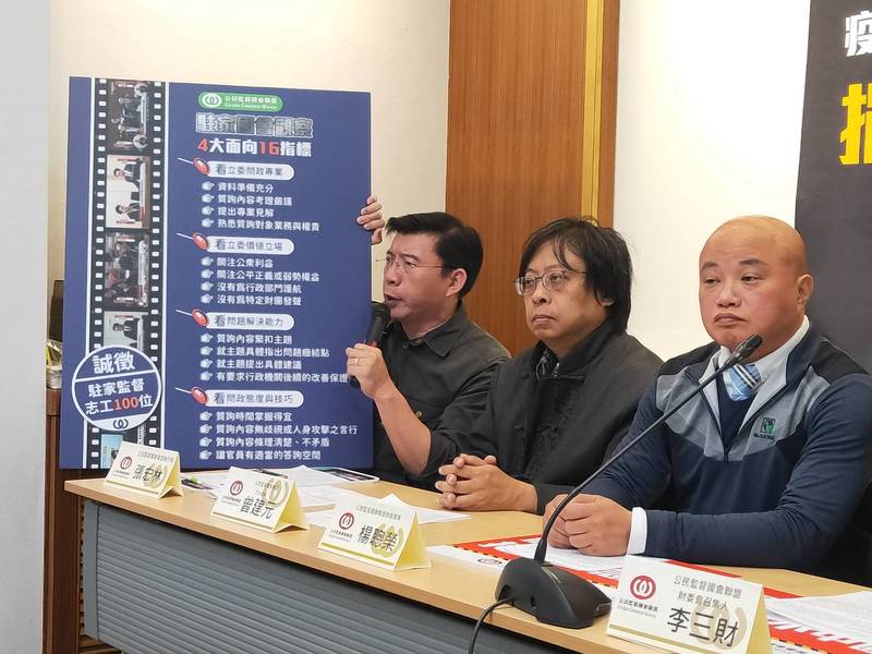 公督盟公布本會期評鑑立委的4大面向,第一是立委質詢的專業程度,可觀查資料準備是否充分與提出專業見解;第二是看立委的價值立場,再來是立委解決問題的能力,質詢是否能指出行政團隊的問題癥結點?最後也可以看立委的問政態度,是否涉及人身攻擊等,都是需要觀察的重點。