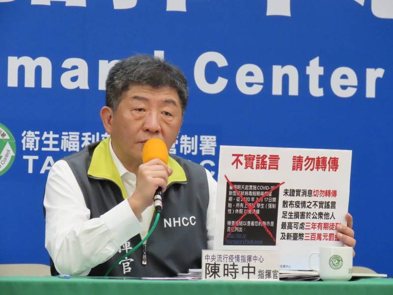 陳時中澄清,近來網路上流傳多起不實疫情資訊,例如提及「明天起實施兩個星期的假期」,他重申,轉傳不實訊息者將處以3年以下有期徒刑、拘役或最高300萬元罰金,民眾務必不要轉貼。陳宗彥也建議,若民眾對訊息有疑問,那就不要再傳。