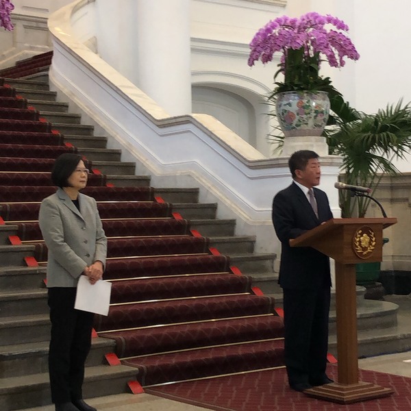 總統府1日舉行疫情談話記者會,總統、部長與發言人等都與記者們保持一段距離,因此都沒有戴口罩。