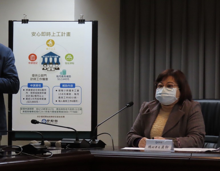 針對受疫情影響勞工導致收入銳減,勞動部13日啟動「安心即時上工計畫」,由地方政府及中央部會提供公共服務的職缺,上路首日提供超過1萬個工作機會,勞力發展署副署長施貞仰表示:「有些職缺還在彙整中,最高會開出6萬個公部門時薪職缺。」
