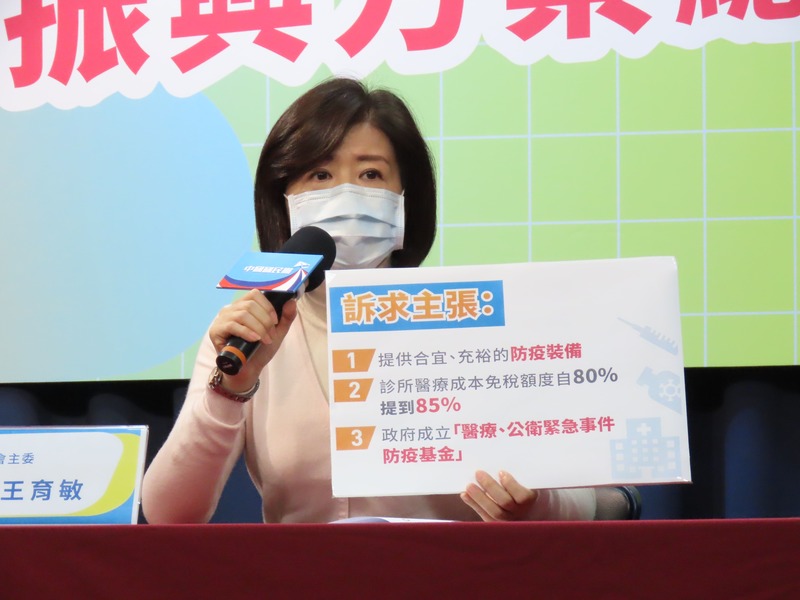 國民黨14日於中央黨部舉辦「籲政府重視基層醫護的心聲」記者會,文傳會主委王育敏指出:「疫情不但使基層診所收入下降3到4成,診所的個人防疫口罩、護目鏡及隔離衣也都是自費。」她呼籲政府應成立「醫療、公衛緊急事件防疫基金」,讓診所面對突發性疫情事件時,能有充足的資金做好第一線防疫的工作。