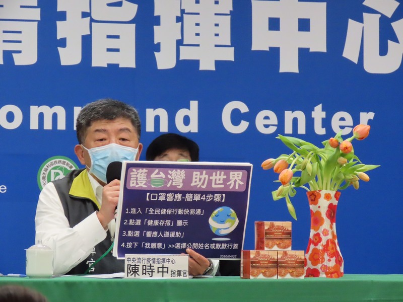 陳時中也在會中宣佈「護臺灣.助世界」活動,即日起民眾能上健保快易通表達捐助口罩的意願。他說:「民眾按下我願意,公開姓名或默默的做,在個人購買的範圍內,你覺得有餘裕願意捐出來,國家再根據國民的心意去評估,怎麼樣進行口罩的醫療援助。」
