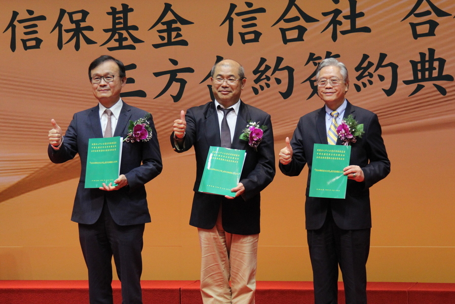 信用合作社聯合社董事長麥勝剛(左起)、中小信保基金董事長李耀魁、合作金庫商業銀行董事長雷仲達完成三方簽約。(photo by 祝潤霖/台灣醒報)