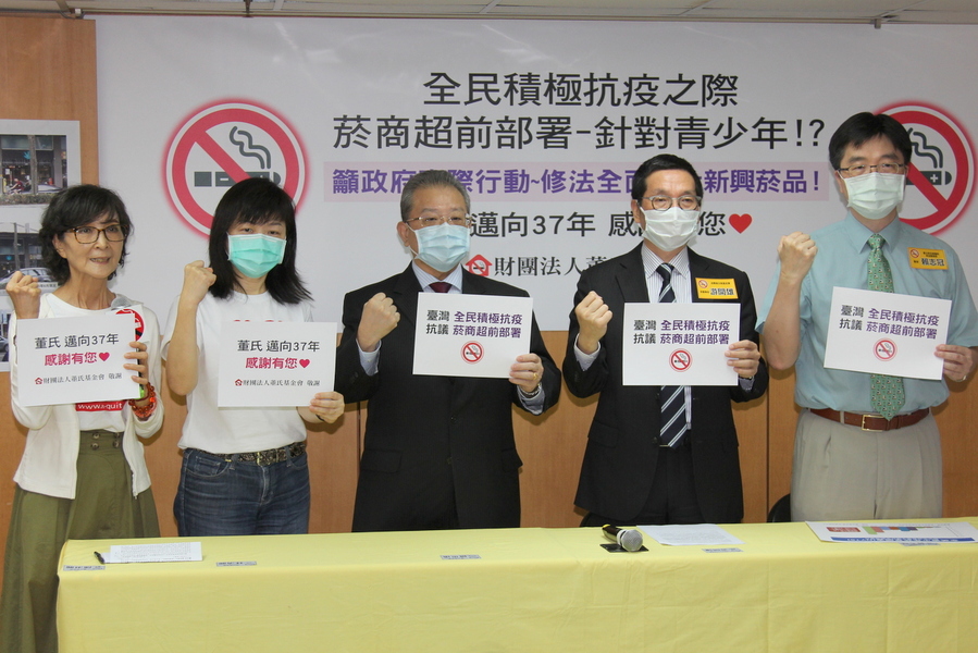 董氏執行長姚思遠指出,菸商趁著防疫期間「超前部署」,以「減害」字眼誤導大眾,以「經貿」藉口向政府施壓,要求開放電子菸、加熱菸等新興菸品。以前把實體店面開在鬧區、夜市、住宅等,現在直接挑學校對面、旁邊開店,還矯情地說「也贊同不可對青少年開放。」希望盡快修法全面管制新興菸品。