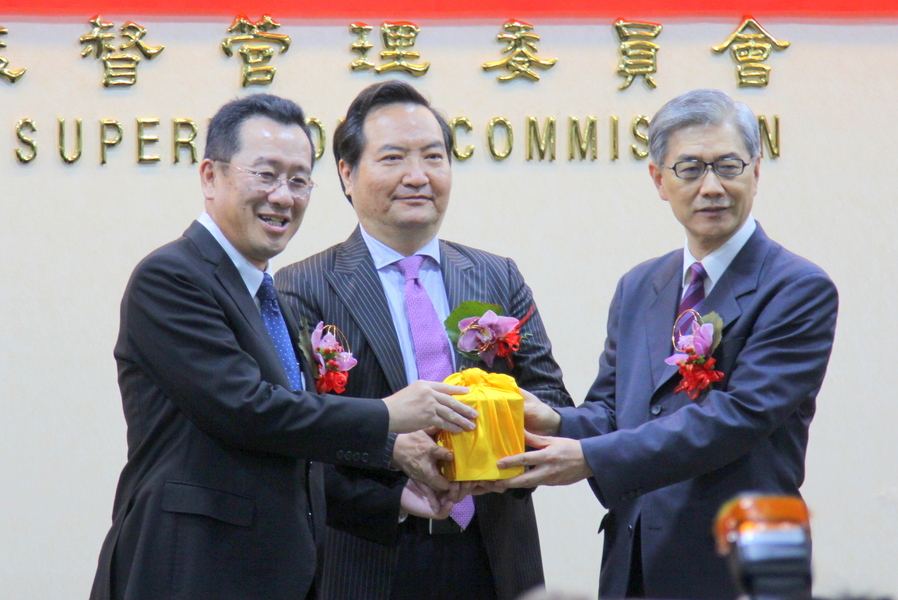 金管會前主委顧立雄(右)卸任交接,監交人、行政院政務委員羅秉成(左)頒贈獎章表彰他在任內的功績。(photo by 祝潤霖/台灣醒報)