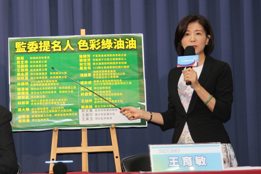 「監委已經變成民進黨酬庸的疏洪道了嗎?」文傳會主委王育敏質疑,包括葉宜津、趙永清等,過去沒看過這麼高比例的前立委,林國明是蔡英文全國律師後援總會的會長,也是黨產會主委林峯正的兄長,還有時代力量創黨元老林郁容,黨產會副主委施錦芳、319槍擊案的隨行醫師蕭自佑等,這根本是一份「報恩名單」。