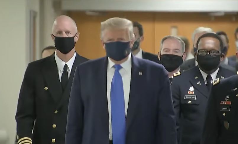 根據《美國國家公廣》報導,川普在前往瑞德國軍醫療中心探望受傷官兵前,在白宮記者會向媒體透露,他「可能」會戴口罩,他接著說:「我想在適當的地方戴口罩是很棒的事情。」並辯稱他從來沒有反對戴口罩,只是認為需要適當的地點與時間。