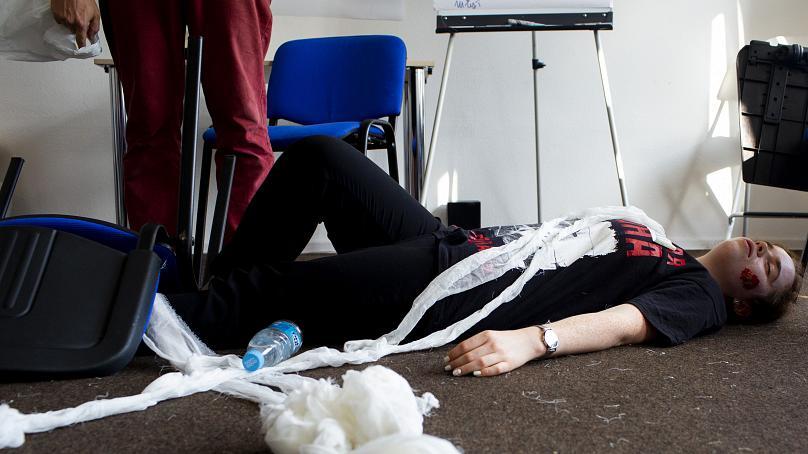 民眾衝向假人傷者包紮受傷失血的部位,另一邊有人大喊著「你叫什麼名字」,以讓傷者保持清醒及思緒。為了讓民眾能在發生緊急狀況時知道如何應對,白俄羅斯數個組織正發起「急救教學」活動,教導人民基礎醫療處理及模擬現實生活中可能遇到的類似情況,以面對突如其來的緊急傷勢處理需求。