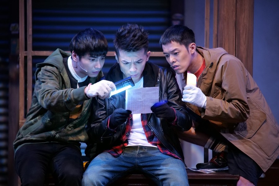 台上簡單的雜貨店佈景長椅上,三個年輕男子因為闖空門被發現,將人綁起留在原處,奪人錢財準備跑路,夜黑風高,三人不慎迷路,意外躲進了這家歇業多年,相傳能消煩解憂的雜貨店。