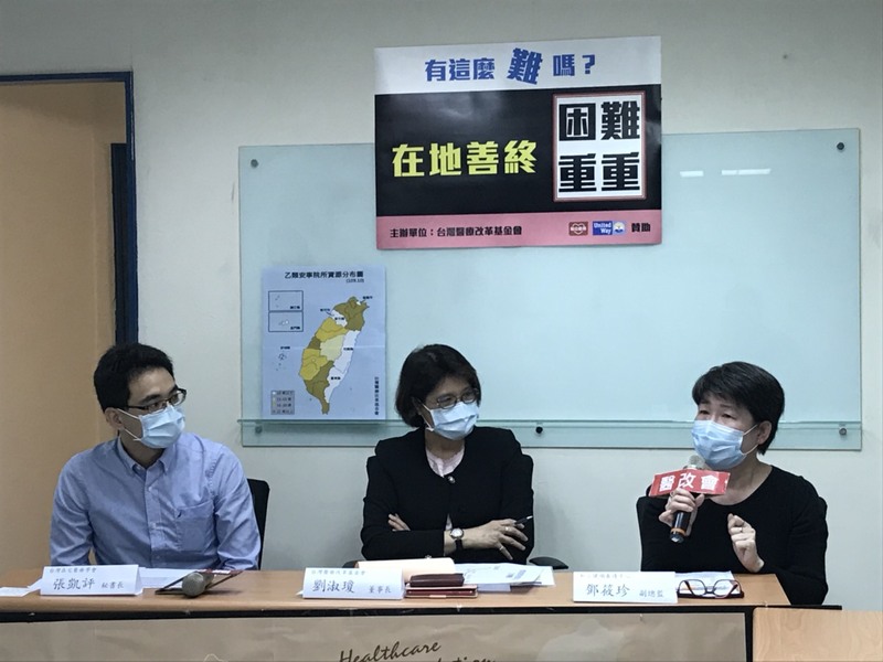 醫改會指出,針對健保署公告的341家乙類安寧的醫療院所或居家護理機構,醫改會抽77家以神秘客電話調查方式詢問其服務提供狀況,發現近3成(28%)沒有實際提供服務;2/3的院所或機構「有條件提供服務」,如需在車程30分鐘內等;政府宣示「將安寧推進長照機構」已第3年,卻仍缺少許多條件,導致機構安寧困難重重。
