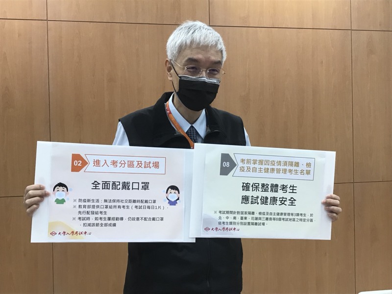 周兆民表示,為因應「嚴重特殊傳染性肺炎」疫情,考生進入考分區須佩帶口罩,經勸導仍故意不戴者,將取消其應試資格,而在試場內若屢經勸導仍不戴口罩或配合查驗身分者,最重該節成績以0分計算,若因特殊身心狀況無法戴口罩,可向大考中心申請證明,移至特定試場,並免戴口罩應試。