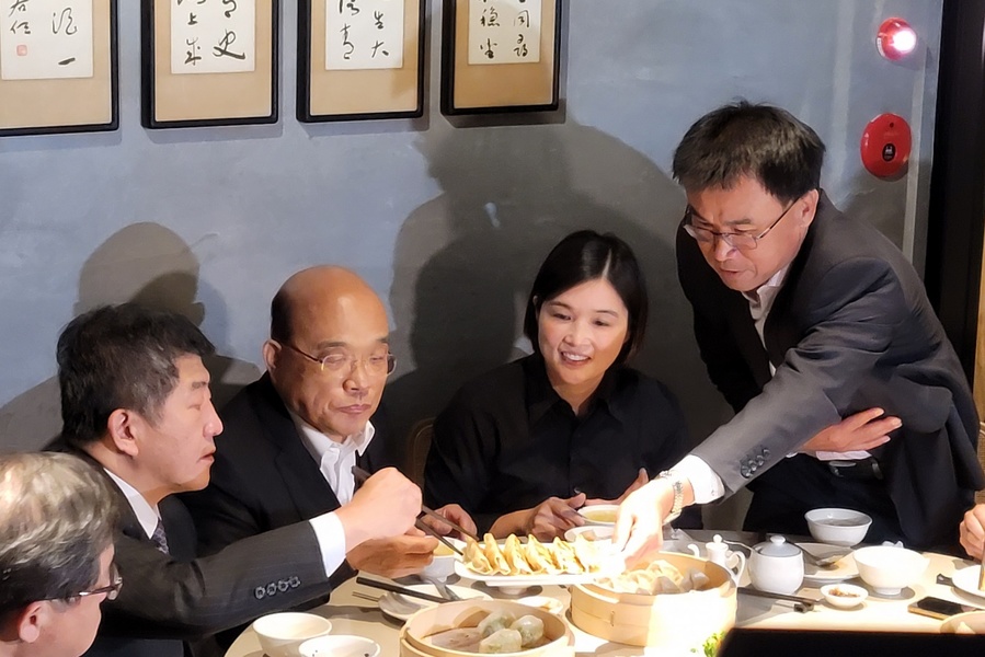行政院長蘇貞昌(中)一筷接一筷大讚國民美食好味,衛福部長陳時中(左2)將鍋貼送入口中。右1為農委會主委陳吉仲(photo by 祝潤霖/台灣醒報)