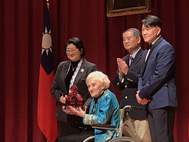 「大家好嗎?」久違露面的彭蒙惠女士身穿寶藍色旗袍,略顯清瘦,乘坐著輪椅出現,不改過往幽默,她在致詞時提到,自己在1948年到大陸傳教,當時蔣公與蔣夫人也在大陸,之後她因戰火來到台灣,他們也來到台灣,後來她與蔣宋美齡女士逐漸相識,她投身教育,而蔣宋美齡女士也很重視教育。