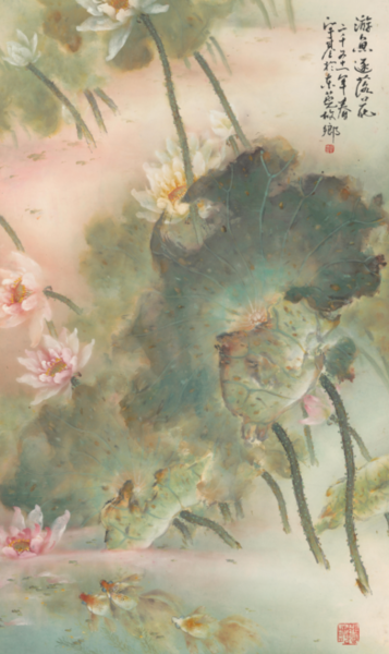 另一巨作為「池塘水繞鴛鴦夢」二聯屏。該畫以墨彩繪寫群葉,遠近聚散得宜,並施以石綠及縱橫高低之荷莖和蓮花;襯著淡雅月光,沈靜映照著相互依偎的鴛鴦。趙少昂老師特別提款,讓畫家受此鼓勵,畢生鍾愛荷花繪製不倦。