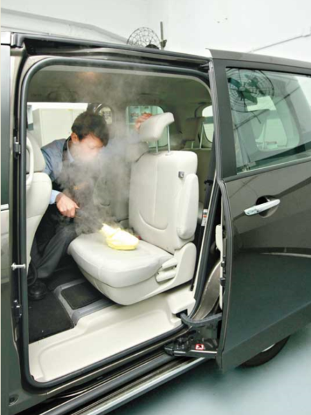 坊間汽車美容業者紛紛提出高溫殺菌處理模式,做全車消毒,這是相當有效的方法之一,運用蒸氣的高溫殺菌,最高溫度能達到 140°C,噴槍在車內噴灑就相當有效,一般就算夏天停在太陽光下,車內溫度也很容易上升到45- 50°C,已經達到大部分殺菌的功用。如果使用器具消毒,除需避免近距離噴灑內裝外,操作人員也務必戴好防護口罩。