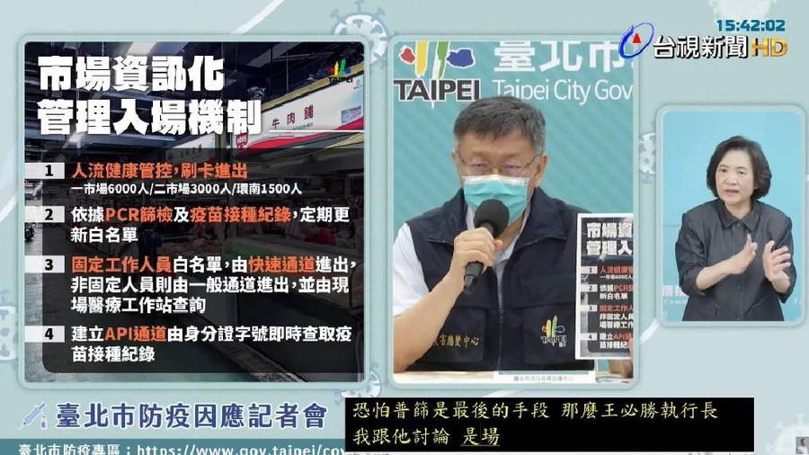 但如果不是北農員工怎麼辦?柯文哲也有考慮利用身分證條碼驗證,但這就要跟內政部討論,因此預計將會在15日公布北農的e化管制進出系統。被問到為何不在5月份對市場採取嚴格防疫措施?柯文哲解釋,北農每天進出1萬人,不可能因為1個人感染就要休市3天,還是要照比例原則。