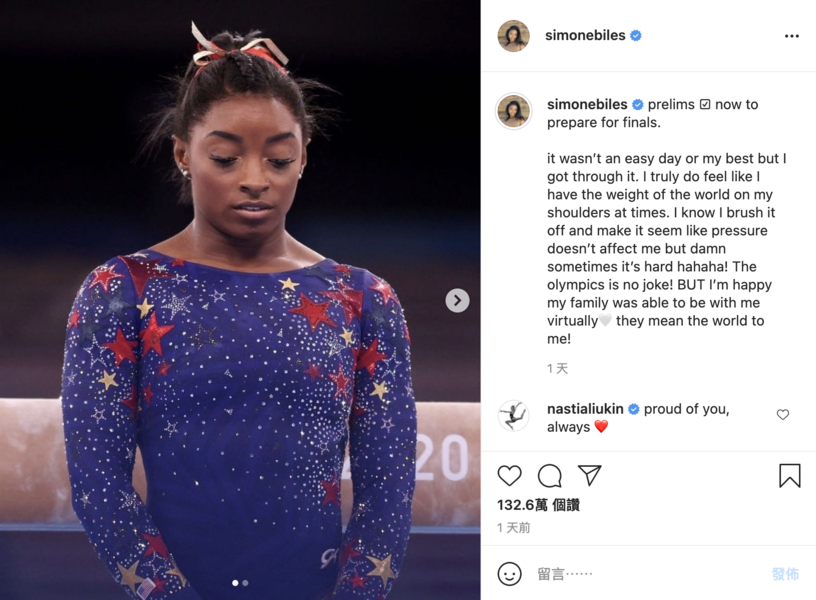 此外,前奧運冠軍、退役美國體操運動員阿里·萊斯曼更指出,拜爾絲於奧運前幾個月的壓力可說是「毀滅性的」龐大。她也說,「奧運運動員也是人,他們正在盡其所能的在這樣的壓力下,在正確的時刻、拿出最完美的表現。」