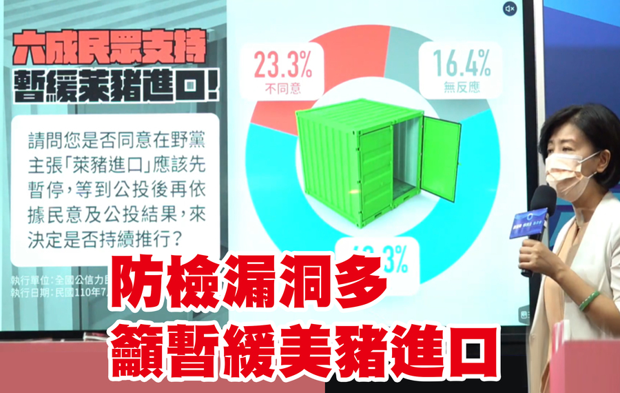 「蘇院長不要再『震怒』了,因為也沒有用。」王育敏說,非洲豬瘟都出現漏洞了,那萊豬進口怎麼辦?人民已經無法相信政府公布的檢驗數字,她呼籲蔡政府在萊豬公投前,先暫緩萊豬進口。根據國民黨民調,有高達60%民眾支持在公投前,暫緩萊豬進口,蔡總統不要漠視民意。