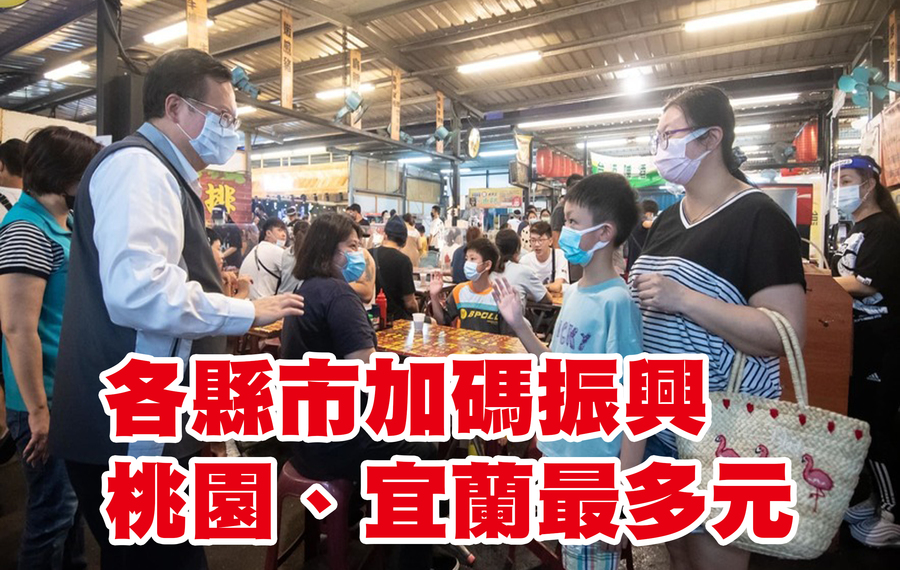 新北市則是推出「新北加倍券」,可以500換1000、1000換2000,甚至最高可以5000換10000,每種券種限定份數、最小面額50元,將可適用於市場、夜市、旅館、觀光工廠,相關抽獎方法會陸續公布。新竹市等其他縣市預計將會推出與百貨賣場合作的消費活動,目前仍在研議中。