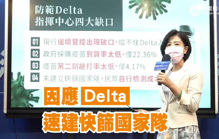 國民黨呼籲蔡政府調整邊境防疫,加速向國際疫苗催貨、尋求民間幫助,讓民眾都能打到第2劑、甚至是第3劑疫苗,並建立快篩國家隊,取消疫苗施打分級順序,由高風險長者開始施打,才能應對Delta變種入侵。