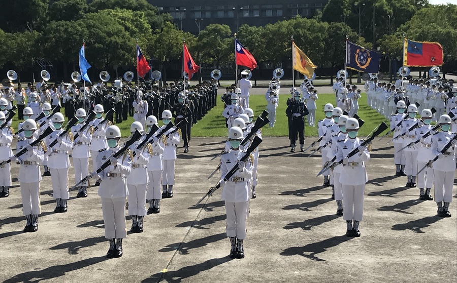 這是三軍樂儀隊為國慶大典所做的提前操演,國防部今(5日)於憲兵指揮部,預演國慶大會的重頭大戲。旗手高舉著國旗與三軍軍旗引領樂儀隊進入會場,隨風飄揚的旗幟在整齊劃一的步伐中是最不合群的存在。