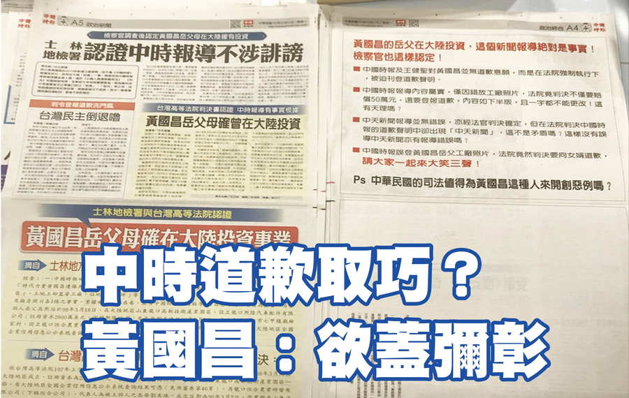 中國時報不甘法院裁定讓該報向黃國昌道歉,於各報的道歉聲明留白,僅在版面左下小角落敘明道歉內容,且於該報同日同版刊登了「黃國昌岳父母確曾在大陸投資」、「台灣民主倒退嚕」等文章,說明報導新聞事實卻被勒令道歉的無奈,控訴台灣司法開惡例為政治人物服務。黃國昌於11日反擊說,中國時報欲蓋彌彰。