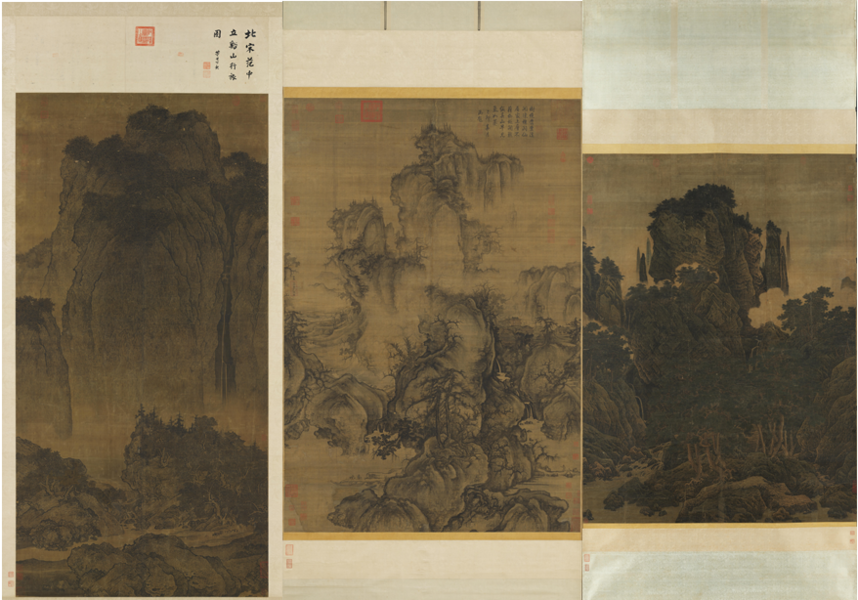 故宮鎮院三寶——范寬〈谿山行旅圖〉(圖左)、郭熙〈早春圖〉(圖中)和李唐〈萬壑松風圖〉(圖右)是北宋巨碑式水墨畫的代表,由於紙壽千年、絹壽八百,三幅畫不輕易見客,出門一次最多42天,還要休息三年;上次「三畫合體」已經是十年前的事了。