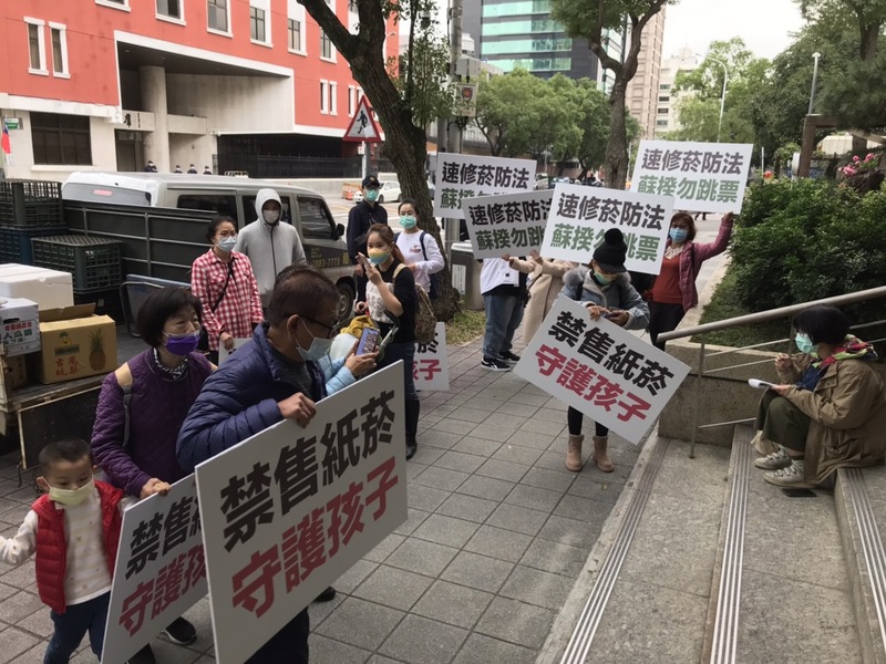 在記者會開始前半個小時,就能在台大校友會館外,看見幾名婦女高舉「速修菸害法」、「禁售紙菸、守護孩子」的標語,身邊更圍繞許多小朋友,跟著母親們依呀學語,說著「禁止紙菸」的宣言。