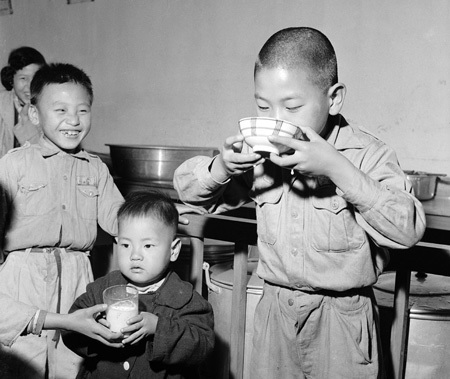 當時美國有援助奶粉,早晨大家排隊領熱騰騰的牛奶。那時家裡實在太窮,只有一支破了底的塘瓷杯子。當牛奶舀給我時,我要用手擋住杯子的破口,趕快將牛奶一飲而盡,否則會漏掉三分之一。