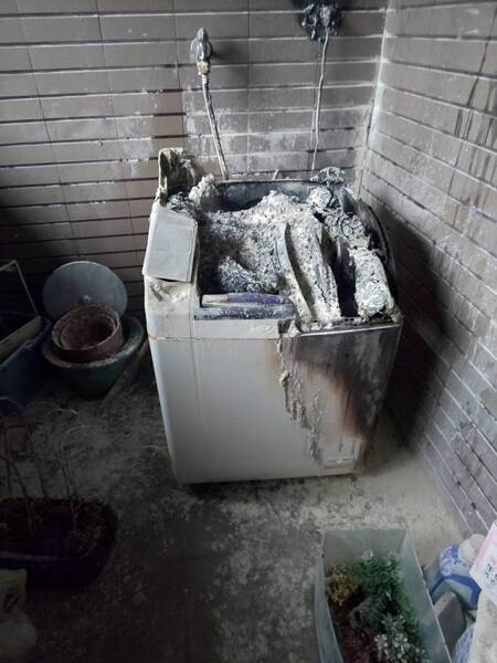 除了洗烘衣機機體之外,陽台磁磚、天花板、燈泡罩均已燻黑,插座焦黑,落塵到處,廚房廚櫃同樣狀況,部分煙燻還入了客廳、房間,還好人無損害。最感恩的是,上帝保守火勢避開了左邊的瓦斯爐,真是萬幸!早上起火時,人亦在屋內,可以應變。該洗衣機發生塑膠老化而產生的自燃情事,真是奇聞。