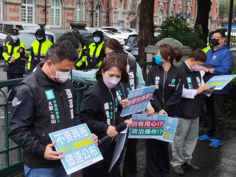【台灣醒報記者呂翔禾台北報導】「查北農就那麼快,那過去承諾要調查3+11的報告呢?」針對監院近日發布北農調查報告,民眾黨台北市議員參選人黃瀞瑩(學姐)、吳怡萱、張志豪等8人7日在監察院門口為台北市府被調查表達不滿,認為監察院報告與事實不符,且曾說要調查3+11的報告如今也無下文。他們痛批監察院到選舉期間,就成為民進黨的政治打手。